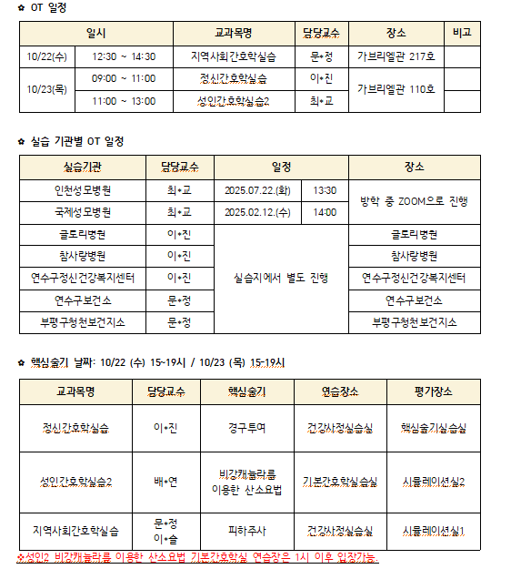 2025년도 2학기 3학년 임상실습 OT 및 핵심술기 일정안내