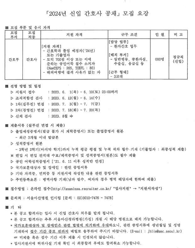 서울아산병원 2024년 신입 간호사 공채