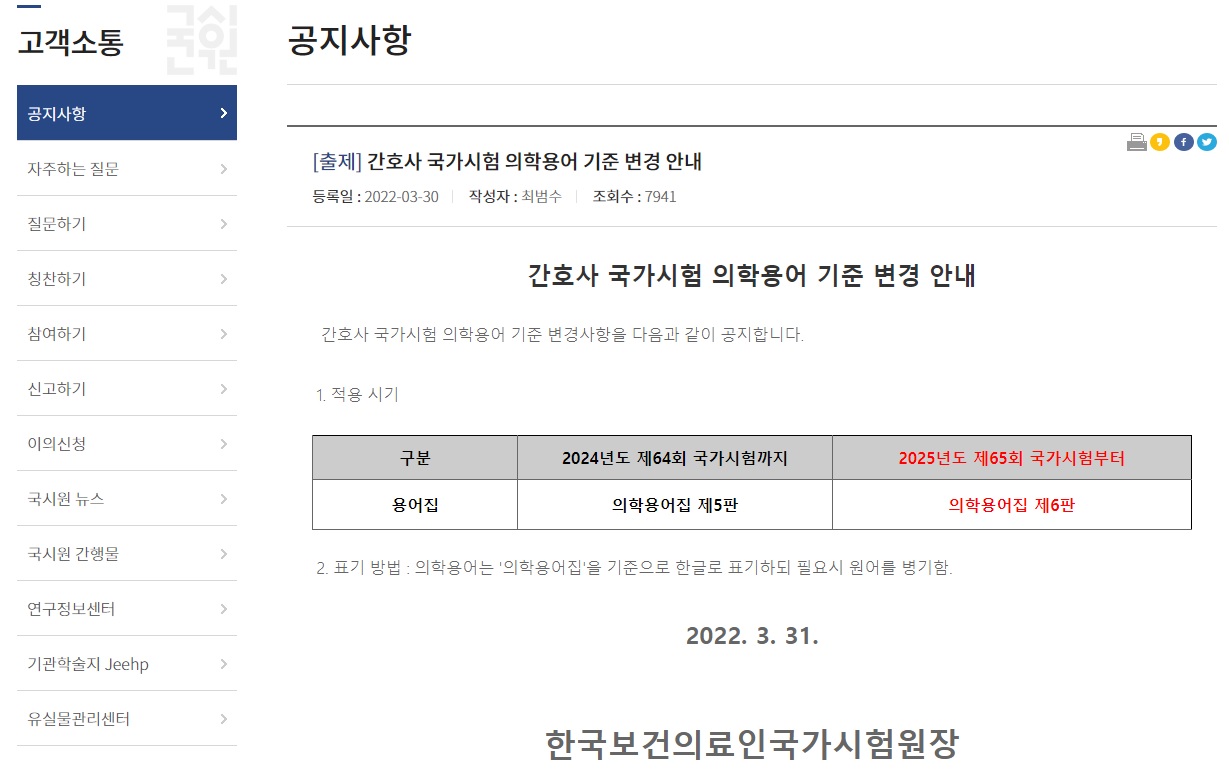 간호사 국가시험 의학용어 기준 변경 안내